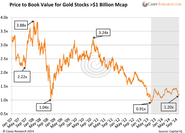 At the current 1.20 times book value, gold stocks aren’t as cheap as they were when we ran the numbers in June, 2013, successfully pinpointing the all-time low of 0.91 (the turning point before the period in gray). Of course, that P/BV is hard to beat: it was one of the lowest values ever. And while the stocks not quite as cheap now, the valuation multiple still lingers close to its historical bottom. Remember, we’re talking about senior mining companies here—producers with real assets and cash flow selling for close to their book values.