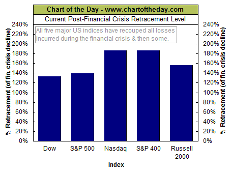 For some perspective on the post-financial crisis rally, today’s chart illustrates how much of the downturn that occurred as a result of the financial crisis has been retraced by each of the five major US stock market indexes. For example, the S&P 500 peaked at 1,565.15 back in October 9, 2007 and troughed at 676.53 back on March 9, 2009. The most recent close for the S&P 500 is 1,565.15 — it has retraced 139% of its financial crisis bear market decline. As today’s chart illustrates, each of these five major stock market indices has recouped all losses incurred during the financial crisis (i.e. all are above 100% on today’s chart). However, it has been the tech-laden Nasdaq and the often overlooked S&P 400 (mid-cap stocks) that have been the star performers with an impressive 186% gain since the financial crisis lows.