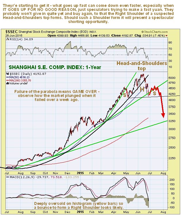 What was predicted for China has started to happen with the dramatic failure of its parabolic uptrend just over a week ago leading to a plunge. The update China Crash was posted when all indicators were at “nosebleed” levels late in April, right after which the third steepest fanline shown on our 1-year chart for the Shanghai Composite Index below was breached. Somewhat amazingly, that overbought peak late in April was not the final top – it rose even higher into early-mid June, but after that, just over a week ago, it finally broke below the parabola and started to cave in.