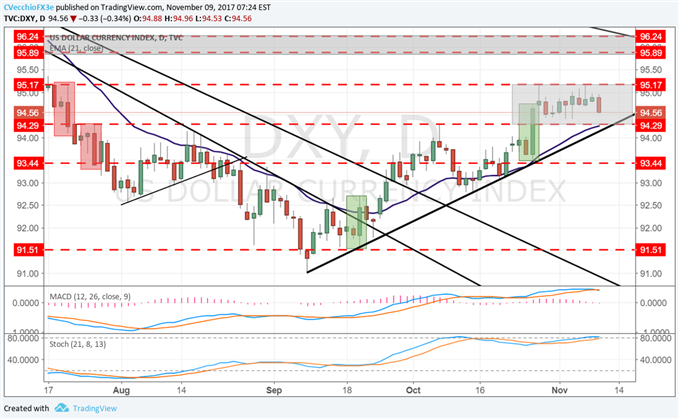 For now, particularly in the run up to the Thanksgiving holiday in the United States in two weeks time, the prospect of tax reform legislation will be the key source of influence for the US Dollar. Speculation around the Fed is lower down the totem pole as a major influence; markets have been pricing in a 100% of a 25-bps rate hike in December for the past two weeks.